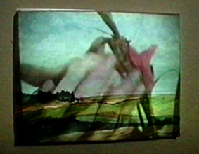 hanging around the mountain Installation mit 3 Videoprojektionen und dem Rollenden Berg around the mountain Video loop 5min Eine Projektion bewegter Hände beschreiben den Berg.