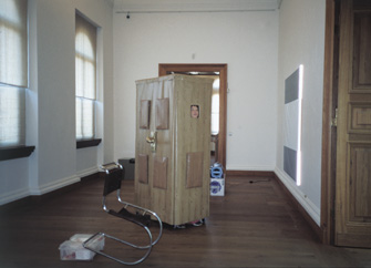 Museum on the roll vierteilige Skulpturengruppe (benutzbar) Treppe, Säule, Tür und Boden Holzunterkonstruktion auf Rollen, PVC-Folien, PVC-Bodenbelag, Füllstoff 2002 |
