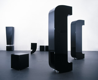 sieben menschgrosse zu bewegende Objekte aus MDF-Holz, auf Rollen, klavierschwarz lackiert