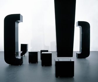 Satzzeichen sieben menschgrosse zu bewegende Objekte aus MDF-Holz, auf Rollen, klavierschwarz lackiert je ca. 210 x 70 x 40 cm 2003