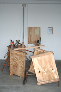 Holz als Weg lehnend Skulptur Birkenholz, Holzpaletten, Glas, Schwamm, Keile, Gummiband, Schraubzwingen, Löschpapier Größe variabel ca. 700 x 300 x 170cm 2008