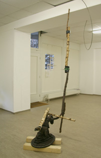 Stützende Sportlerin Holzbalken 45 x 10 x10cm Tänzerin Gipsguß 40 x 110 x 30cm Birkenrohholz unterschiedlicher Länge ca. 100cm x 5cm Klebeband , Expander 2008